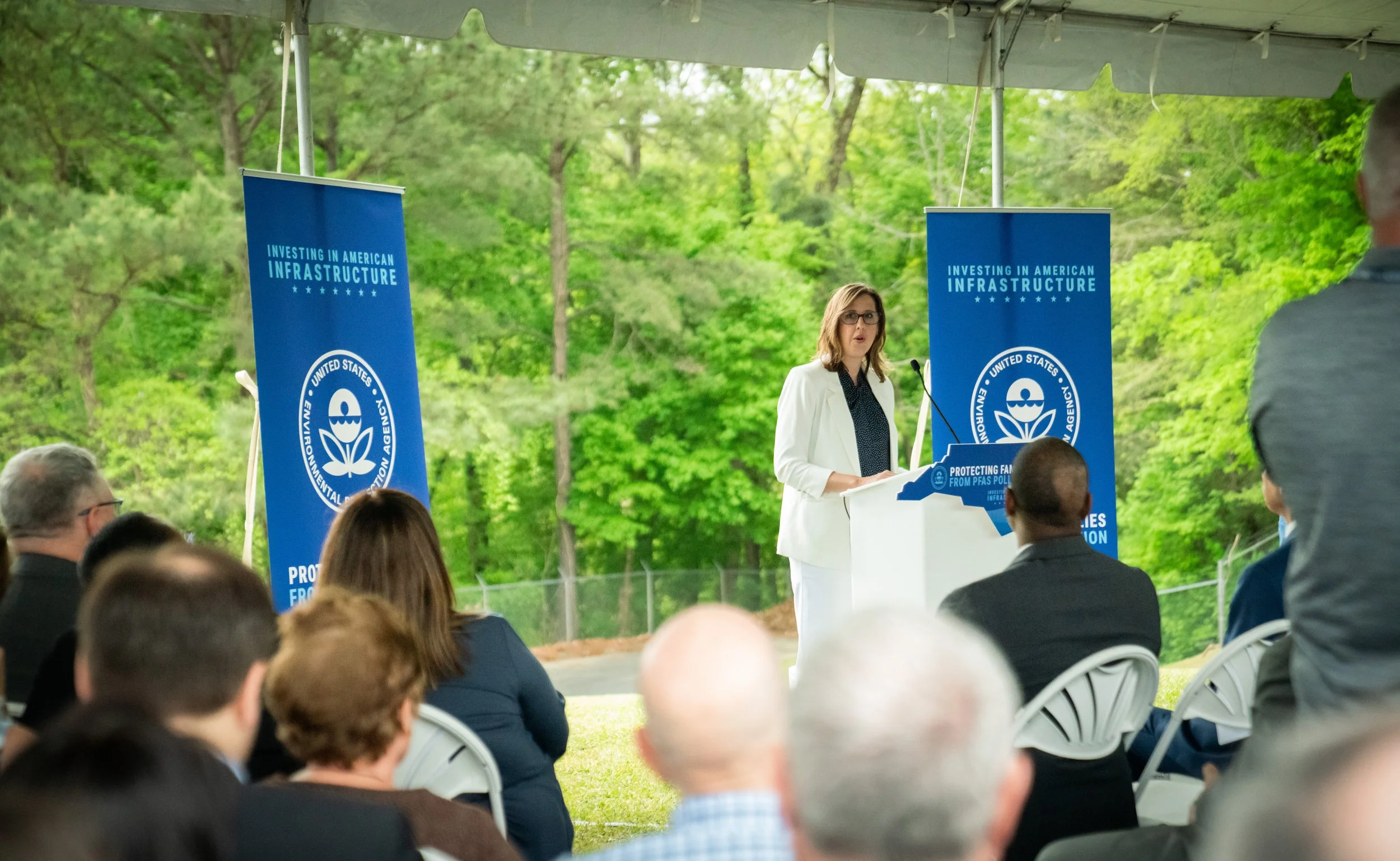 April 2024: Emily Donovan introducing EPA Administrator Michael Regan at press event celebrating first ever federal PFAS drinking water standards.